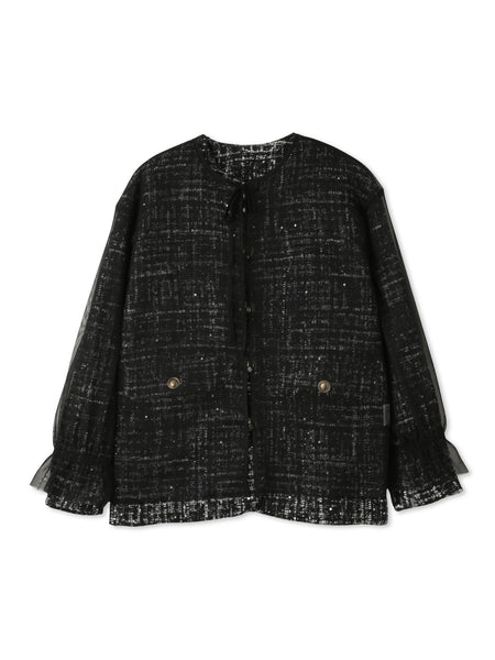 ●POINTミックスカラーのツィードジャケットと単品使いも可能なチュールカーディガンの2ピースセットアイテムです。ツィードジャケットは中にニットなども着こめるゆとりのある設計にしています。前立て部分とポケットフラップ部分のメタルカラーボタンがリッチ感をプラスします。また、チュールカーディガンはナローコードを配置したネックデザインで、袖先はキャンディスリーブになっており、重ねて着て頂いたときにふんわりと軽やかなフェミニンフォルムに仕上げます。お手持ちのアウターやグラフィックTシャツなどとのレイヤードスタイルにも応用ができ、着こなしの幅を広げます。キレイ目なボトムスとあわせてエレガントカジュアルに、デニムなどのカジュアルボトムスとあわせてテイストMIXスタイルもおすすめです。----------------------------------透け感:なし厚さ: やや厚い伸縮性:なし裏地: ありポケット: あり--------------------------------------------------------------------------------------------------洗濯方法家庭洗濯:家庭での洗濯禁止。アイロン:底面温度120 ℃を限度としてスチームなしでアイロン仕上げができる。ドライクリーニング:ドライクリーニング禁止。----------------------------------------------------------------■モデル身長 165cm 着用サイズ M※画像の商品はサンプルとなりますので実際の商品と仕様、加工、サイズが若干異なる場合がございます。※お客様のモニター環境により実際のお色と多少異なる場合がございます。※撮影状況や光の当たり具合により、色合いが異なって見える場合がございます。関連ワード:QUEENS COURT クイーンズコート レディース 新作 フェミニン 大人コーデ 2026春夏 2026SS 春夏 春物 春服 綿/コットン 合成繊維/ポリエステル レーヨン