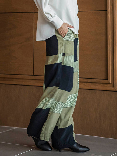 【デザインPOINT】「視線を惹きつける、柄の余韻。」IPEKER社のプリントを贅沢に使用した、イージーワイドパンツ。前パッチポケットを付けることで、柄にリズム感を加えたデザイン。デイリーに合わせやすい、広がりをおさえたワイドシルエット。ウエストは総ゴム・ストレスフリー、内側コードで調節が可能。ソフトタイプの裏地付き。【スタイリング】柄の存在感を活かして、他はミニマルにまとめるのがポイント。ふんわりニットを合わせれば、柔らかい印象に。【素材の特徴】【IPEKER幾何柄プリント】高い技術を持つ、トルコの生地メーカー”IPEKER社”のプリント生地を使用。ソフトで滑らかな風合いが魅力の、キュプラ/レーヨン素材。----------------------------------------------------------------洗濯方法家庭洗濯:液温は40℃を限度とし、手洗いができる。自然乾燥:日陰の吊り干しがよい。アイロン:底面温度120℃を限度としてアイロン仕上げができる。ドライクリーニング:石油系溶剤による弱いドライクリーニングができる。----------------------------------------------------------------■モデル身長 166cm 170cm / 着用サイズ M※画像の商品はサンプルとなりますので実際の商品と仕様、加工、サイズが若干異なる場合がございます。※お客様のモニター環境により実際のお色と多少異なる場合がございます。※撮影状況や光の当たり具合により、色合いが異なって見える場合がございます。関連ワード:MAYSON GREY メイソングレイ レディース 新作 大人コーデ 大人カジュアル 2025秋冬 2025AW 秋冬 秋物 秋服 ワイドルーズ レーヨン 幾何柄 紐 ゴム