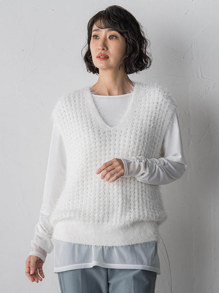 【デザインの特徴】いつものスタイルを一瞬で格上げ。軽やかに着映える、フェザーヤーンの透かし編みジレ。フェザーヤーンを透かし編みで仕上げることで、重さを感じさせない軽やかな抜け感を実現しました。Vネックのシャープさが、フェザーヤーンの甘さを程よく引き締め、大人の女性にふさわしい上品なカジュアルを演出します。【機能性】◆Washableご自宅での手洗いが可能----------------------------------------------------------------洗濯方法家庭洗濯:液温は40℃を限度とし、手洗いができる。自然乾燥:日陰の平干しがよい。アイロン:底面温度120℃を限度としてアイロン仕上げができる。ドライクリーニング:石油系溶剤による弱いドライクリーニングができる。----------------------------------------------------------------※画像の商品はサンプルとなりますので実際の商品と仕様、加工、サイズが若干異なる場合がございます。※お客様のモニター環境により実際のお色と多少異なる場合がございます。※撮影状況や光の当たり具合により、色合いが異なって見える場合がございます。※商品タグに記載されたサイズはヌードサイズです。実際の商品のサイズは商品情報の実寸をご確認ください。関連ワード:la.f… ラ エフ レディース 新作 大人コーデ シンプル フォーマル モード マニッシュ 2025秋冬 2025AW 秋冬 秋物 秋服