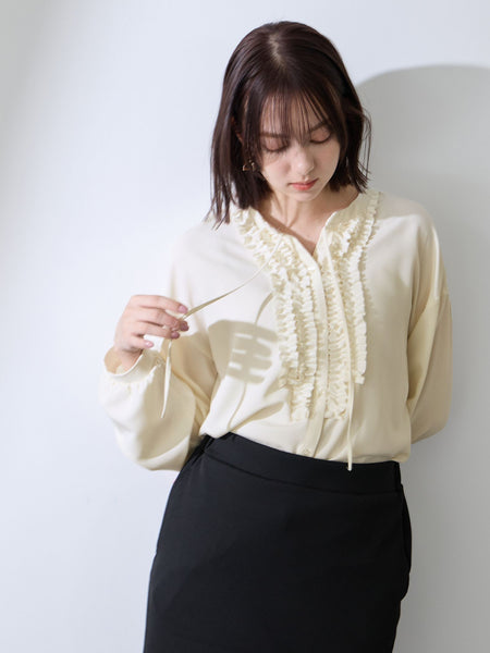 ●POINTマットで上品な表面感、細かいシボ(凹凸)があり、独特の肌触りが特徴のジョーゼット生地に、伸縮性(ストレッチ性)を加えたテキスタイルを使用しています。前立て部分に寄り添って2列ずつミニフリルとナローコードを配置したデザインで、リボン結びでフェミニンに、コードを垂らして抜け感のある着こなしに。腰位置上までのフリルの長さなので、タックインスタイルでもウエストがもたつくことがないのもポイントです。一枚でもちろんですが、アウターやジャケットスタイルに華やかさをプラスするインナーとしてもおすすめです。----------------------------------透け感:ややあり厚さ: 普通伸縮性:あり裏地: なしポケット: なし--------------------------------------------------------------------------------------------------洗濯方法家庭洗濯:液温は40℃を限度とし、手洗いができる。自然乾燥:日陰の吊り干しがよい。アイロン:底面温度120℃を限度としてアイロン仕上げができる。ドライクリーニング:石油系溶剤による弱いドライクリーニングができる。----------------------------------------------------------------■モデル身長 165cm 着用サイズ M※画像の商品はサンプルとなりますので実際の商品と仕様、加工、サイズが若干異なる場合がございます。※お客様のモニター環境により実際のお色と多少異なる場合がございます。※撮影状況や光の当たり具合により、色合いが異なって見える場合がございます。関連ワード:QUEENS COURT クイーンズコート レディース 新作 フェミニン 大人コーデ 2026春夏 2026SS 春夏 春物 春服 ブラウス ポリエステル 無地 長袖