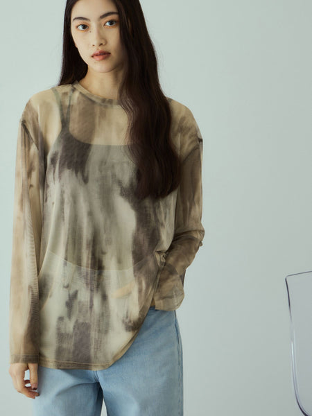 ●POINTアート風のマーブル柄がスタイリングにニュアンス感を与える一枚です。ブルー系はくすみブルー〜ブラウンのグラデーションに、グリーン系はカーキブラウン〜ベージュのグラデーションになっています。全体的に入っている柄のおかげでシアー感が鈍くなり、気恥ずかしさを軽減し、一枚でもサマになるデザインにです。秋口にはベストやオーセンティックなシンプルなシャツとのレイヤードスタイルがおすすめです。----------------------------------透け感:あり厚さ: 薄い伸縮性:あり裏地: なしポケット: なし--------------------------------------------------------------------------------------------------洗濯方法家庭洗濯:液温は30℃を限度とし、手洗いができる。自然乾燥:日蔭の吊り干しがよい。アイロン:底面温度120℃を限度としてアイロン仕上げができる。ドライクリーニング:石油系溶剤による弱いドライクリーニングができる。----------------------------------------------------------------■モデル身長 165cm 着用サイズ M※画像の商品はサンプルとなりますので実際の商品と仕様、加工、サイズが若干異なる場合がございます。※お客様のモニター環境により実際のお色と多少異なる場合がございます。※撮影状況や光の当たり具合により、色合いが異なって見える場合がございます。関連ワード:VICKY ビッキー レディース 新作 大人カジュアル 大人コーデ 2025秋冬 2025AW 秋冬 秋物 秋服 カットソー ポリエステル クルーネック 総柄 長袖