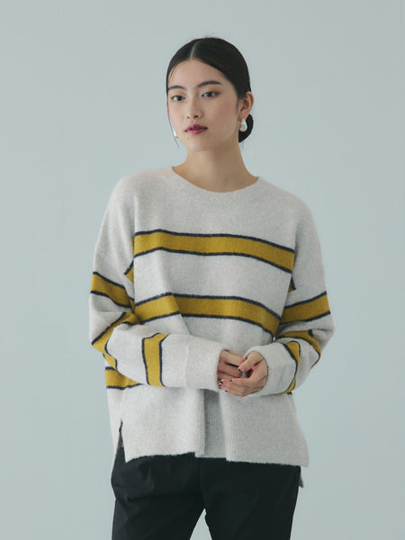 ●POINTウールを含む5者混の糸を使用し、表面に起毛感を持たせた編地が特徴のミックスカラーボーダーのウール混ニットプルオーバーです。ヴィンテージ・レトロ感のある配色がアウターインのスタイリングが増える時期のコーディネートのポイントに。ドロップショルダーで抜け感のあるシルエットなので、インナーにシャツをあわせたスタイルでも窮屈感の少ないレイヤードスタイルが叶います。また、パンツやスカートなどどんなシルエットとも好相性、が嬉しい一枚です。----------------------------------透け感:なし厚さ: やや厚い伸縮性:あり裏地: なしポケット: なし--------------------------------------------------------------------------------------------------洗濯方法家庭洗濯:液温は30℃を限度とし、手洗いができる。自然乾燥:日蔭の平干しがよい。アイロン:底面温度120℃を限度としてアイロン仕上げができる。ドライクリーニング:石油系溶剤による弱いドライクリーニングができる。----------------------------------------------------------------■モデル身長 165cm 着用サイズ M※画像の商品はサンプルとなりますので実際の商品と仕様、加工、サイズが若干異なる場合がございます。※お客様のモニター環境により実際のお色と多少異なる場合がございます。※撮影状況や光の当たり具合により、色合いが異なって見える場合がございます。関連ワード:VICKY ビッキー レディース 新作 大人カジュアル 大人コーデ 2025秋冬 2025AW 秋冬 秋物 秋服 ニット ポリエステル アクリル ウール ナイロン クルーネック ボーダー 長袖