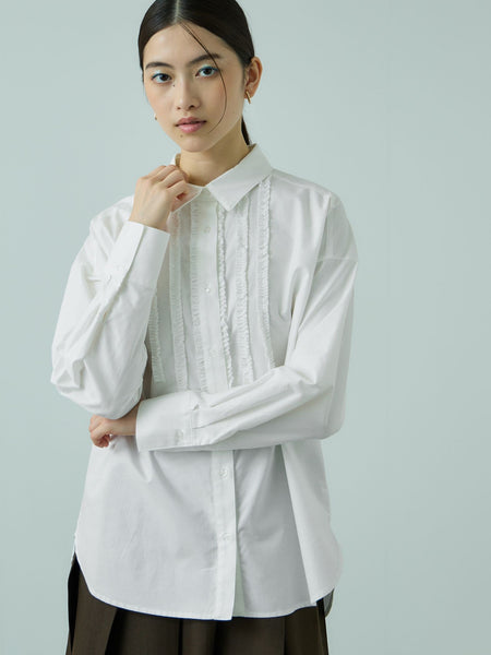 ●POINT程よい厚みとハリがあるオックス素材を使用しています。メンズライクに振れがちなテキスタイルなので、ミニフリルデザインで少しだけ糖度を、ドロップショルダーデザインで抜け感をプラスしています。カラーやコーディネートのアイテムによって、モードにもプレッピーなスタイルにも表現できるアイテムです。オックス地はその織り方から通気性が良いとされ、盛夏以外のロングタームでご着用いただけます。もともとオーセンティックなスタイルが似合うアイテムですが、デニムなどにあわせたカジュアルルックもおすすめの一枚です。----------------------------------透け感:淡色のみややあり厚さ: 普通伸縮性:なし裏地: なしポケット: なし--------------------------------------------------------------------------------------------------洗濯方法家庭洗濯:液温は40℃を限度とし、手洗いができる。自然乾燥:日蔭の吊り干しがよい。アイロン:底面温度120℃を限度としてアイロン仕上げができる。ドライクリーニング:石油系溶剤による弱いドライクリーニングができる。----------------------------------------------------------------■モデル身長 165cm 着用サイズ M※画像の商品はサンプルとなりますので実際の商品と仕様、加工、サイズが若干異なる場合がございます。※お客様のモニター環境により実際のお色と多少異なる場合がございます。※撮影状況や光の当たり具合により、色合いが異なって見える場合がございます。関連ワード:VICKY ビッキー レディース 新作 大人カジュアル 大人コーデ 2025秋冬 2025AW 秋冬 秋物 秋服 シャツ コットン ポリエステル 長袖