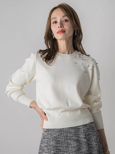 【デザインの特徴】華やかに散りばめられたビジューとホワイトパールが、シンプルなクルーネックデザインに上品な輝きをプラスするニットトップス。肌触りの良いレーヨンポリエステル混紡糸を使用し、着心地も抜群です。特別な日の装いにぴったりで、パーティーやイベントなど華やかなシーンでの着用におすすめ。控えめながらも存在感のある装飾が、顔周りを明るく華やかに演出します。シンプルなシルエットで合わせやすく、スカートやパンツなど様々なボトムとコーディネート可能。大人の女性にふさわしいエレガントな一着です。----------------------------------------------------------------洗濯方法家庭洗濯:液温は30℃を限度とし、手洗いができる。自然乾燥:日陰の平干しがよい。アイロン:底面温度120℃を限度としてアイロン仕上げができる。ドライクリーニング:石油系溶剤による弱いドライクリーニングができる。----------------------------------------------------------------■モデル身長 169cm/着用サイズ M※画像の商品はサンプルとなりますので実際の商品と仕様、加工、サイズが若干異なる場合がございます。※お客様のモニター環境により実際のお色と多少異なる場合がございます。※撮影状況や光の当たり具合により、色合いが異なって見える場合がございます。※商品タグに記載されたサイズはヌードサイズです。実際の商品のサイズは商品情報の実寸をご確認ください。関連ワード:Viaggio Blu ビアッジョブルー レディース 新作 大人カジュアル 大人コーデ レディース キレイめ フェミニン エレガント 華やか 上品 秋 秋服 2025AW AW 2025秋冬