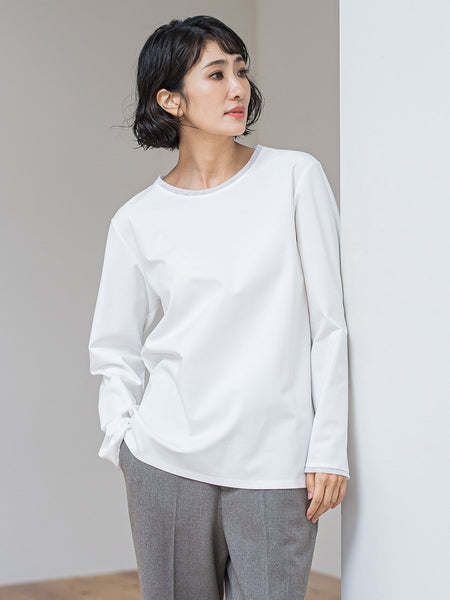 【デザインの特徴】首元と袖にあしらったチュール切り替えが、シンプルな中に華やかさを添える長袖カットソー。ジャケットのインにも映えるデザインで、通勤やきれいめカジュアルに幅広く活躍します。----------------------------------------------------------------洗濯方法家庭洗濯:液温は30℃を限度とし、洗濯機で非常に弱い洗濯ができる。自然乾燥:日陰の吊り干しがよい。アイロン:底面温度120℃を限度としてアイロン仕上げができる。ドライクリーニング:石油系溶剤による弱いドライクリーニングができる。----------------------------------------------------------------※画像の商品はサンプルとなりますので実際の商品と仕様、加工、サイズが若干異なる場合がございます。※お客様のモニター環境により実際のお色と多少異なる場合がございます。※撮影状況や光の当たり具合により、色合いが異なって見える場合がございます。※商品タグに記載されたサイズはヌードサイズです。実際の商品のサイズは商品情報の実寸をご確認ください。関連ワード:la.f… ラ エフ レディース 新作 大人コーデ シンプル フォーマル モード マニッシュ 2025秋冬 2025AW 秋冬 秋物 秋服