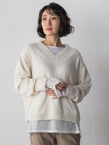 【デザインの特徴】まるで光を纏ったようなほのかなツヤは、暗くなりがちな冬の装いをパッと華やかにし、一枚で着ても、コートから覗かせても、周囲と差がつくスタイルが簡単に完成します。深すぎないVネックが、首元からデコルテラインをすっきりとシャープに演出。【機能性】◆Washableご自宅での手洗いが可能----------------------------------------------------------------洗濯方法家庭洗濯:液温は40℃を限度とし、手洗いができる。自然乾燥:日陰の平干しがよい。アイロン:底面温度120℃を限度としてアイロン仕上げができる。ドライクリーニング:石油系溶剤による弱いドライクリーニングができる。----------------------------------------------------------------※画像の商品はサンプルとなりますので実際の商品と仕様、加工、サイズが若干異なる場合がございます。※お客様のモニター環境により実際のお色と多少異なる場合がございます。※撮影状況や光の当たり具合により、色合いが異なって見える場合がございます。※商品タグに記載されたサイズはヌードサイズです。実際の商品のサイズは商品情報の実寸をご確認ください。関連ワード:la.f… ラ エフ レディース 新作 大人コーデ シンプル フォーマル モード マニッシュ 2025秋冬 2025AW 秋冬 秋物 秋服