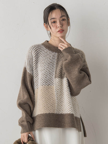 バイアス柄のジャカード編みをブロッキングデザインで仕上げた目を引く1枚。さっと着るだけでコーディネイトの主役になるニットです。ニットらしいざっくりとした編地でゆとりのあるボクシーラインに仕上げることで気になる体のラインをカバー。コンパクトなクルーネックなので、首元をすっきりと見せることができ、インナーにハイネックカットソーなどを重ねてレイヤードコーディネイトも楽しめます。【素材の特徴】柔らかく、もっちりとした糸と毛足のあるフェザーヤーンを組み合わせています。ウールや獣毛のチクチク感がなく。直接肌にあたってもストレス無く着ていただけます。----------------------------------------------------------------洗濯方法家庭洗濯:液温は40℃を限度とし、手洗いができる。自然乾燥:日蔭の平干しがよい。アイロン:底面温度120℃を限度としてアイロン仕上げができる。ドライクリーニング:石油系溶剤による弱いドライクリーニングができる。----------------------------------------------------------------※画像の商品はサンプルとなりますので実際の商品と仕様、加工、サイズが若干異なる場合がございます。※お客様のモニター環境により実際のお色と多少異なる場合がございます。※撮影状況や光の当たり具合により、色合いが異なって見える場合がございます。※商品タグに記載されたサイズはヌードサイズです。実際の商品のサイズは商品情報の実寸をご確認ください。関連ワード:Droitelautreamont ドロワットロートレアモン レディース 新作 トレンド 大人フェミニン 2025秋冬 2025AW 秋冬 冬物 冬服 ニット ポリエステル アクリル ナイロン クルーネック 長袖