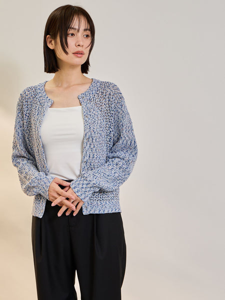 ●POINTコットン混の奥行きをもたらすミックスカラーが印象的なニットカーディガンです。ミドルゲージですが、前後で身頃の編地を変えることで軽やかな印象に仕上げています。ネイルが長くても開け閉めが簡単なリングドットボタン仕様で、ナチュラルな表情の中に、メタリックフレームの質感がモードエッセンスをプラスします。同素材のアイテムにミックスコイルクロップドニットベスト(4112-60048)があり、アンサンブルでのご着用も可能でコーディネートのバリエーションを広げます。ボディに寄り添うシルエットなので、フレアスカートやワンピース、ワイドパンツなどとのスタイリングがおすすめです。----------------------------------透け感:淡色のみややあり厚さ: やや厚い伸縮性:あり裏地: なしポケット: なし--------------------------------------------------------------------------------------------------洗濯方法家庭洗濯:液温は40℃を限度とし、手洗いができる。自然乾燥:日陰の平干しがよい。アイロン:底面温度120℃を限度としてアイロン仕上げができる。ドライクリーニング:石油系溶剤による弱いドライクリーニングができる。----------------------------------------------------------------■モデル身長 165cm 着用サイズ M※画像の商品はサンプルとなりますので実際の商品と仕様、加工、サイズが若干異なる場合がございます。※お客様のモニター環境により実際のお色と多少異なる場合がございます。※撮影状況や光の当たり具合により、色合いが異なって見える場合がございます。関連ワード:ketty ケティ レディース 新作 大人コーデ 2026春夏 2026SS 春夏 春物 春服 カーディガン ニット コットン ポリエステル レーヨン アクリル クルーネック 無地 長袖 オフィス 旅行 デート 通勤 ホテルディナー アフタヌーンティー