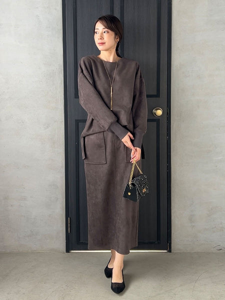 【デザイン】同素材プルオーバー・ワンピースとセットアップで着られるフェイクスエードのナロースカート。すっきりとしたナローシルエットながら、体のラインを拾いにくい絶妙な分量に仕上げています。後ろウエストはゴム仕様でラクな穿き心地。左脇ファスナーで着脱しやすく、シンプルながらも細部まで使いやすさにこだわった一枚です。裾にはベンツ開き(しつけ糸あり)を入れ、歩きやすさと上品な印象を両立。ポケット付きなのも嬉しいポイントです。【素材】柔らかな風合いと上品な表面感が魅力のフェイクスエード素材。ストレッチが効いており、動きやすく快適に着用いただけます。【仕様】裏地なし後ろウエストゴム左脇ファスナーあきポケットあり裾ベンツあき(しつけ糸あり)