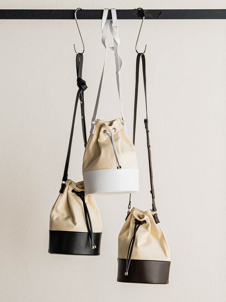 リサイクルのキャンバス素材を使用した、「ちょっとそこまで」に丁度いい巾着バッグ。紐先やハトメのシルバーがアクセントになり、上品さを演出しています。レザーとキャンバスのバランスにもこだわり、きれいめに仕上げました。巾着タイプなので、紐を絞って開け閉めすることができます。内側は裏付き、内ポケットも付いているので、小さいながら使えるミニバッグになっています。底には芯を入れ、しっかりしたつくりにしています。APPLE LEATHER とは?アップルレザーとはサスティナブルなヴィ―ガンレザーの一種です。“りんごジュースの生産工場から出るフードロスの問題を解決したい”という想いから、 廃棄されていたりんごの搾りかす (皮や芯) を乾燥させ、合成レザーの原料の一部としてアップサイクルするというアイディアが生まれました。レザーの風合いを損なわないように適切な分量で樹脂と配合され誕生したのがアップルレザーです。[ なぜ価値が高いの? ]地球環境に配慮し、 限られた石油資源の消費を抑えるため、植物を主原料とした樹脂を使用した素材が開発されています。ジュースやジャム等の搾りかすを使用するため、 原料として集めるのに手間がかかったり、リサイクルする工程があるため、 合皮に比べればやや高価になります。ですが、 これまで当然に廃棄されてきたものが、 素敵な商品に生まれ変わることってとても価値あることだと思いませんか?アップルレザーのココがポイント!01. 環境にやさしい焼却処分によって二酸化炭素 -CO2- を発する、 従来のフェイクレザー (石油由来) に対し、ヴィーガンレザーは植物由来のため、 使用後も土に還る、 環境に配慮した素材です。02. 耐久性 ・ 耐水性に優れているアップルレザーは、ヴィ―ガンレザーの中でも耐久性が高いとされており、パウダー状になった粒子が組織を作るため、 通気性も兼ね備えています。また撥水性にも優れており、 少しの水濡れなら乾いた布で乾拭きするだけで OK です!このような素材の特性を生かし、 スニーカーや革靴、 車のシートにも利用されています。