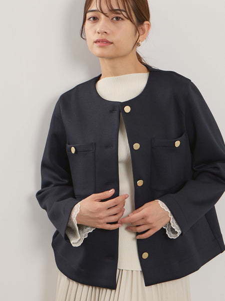 ●POINTカルゼ織りの斜めの畝とダンボールニットのふくらみが組み合わさり、ウールジャケットのような表情を醸す、上品で高級感のあるノーカラージャケットです。見た目の分量感に反して、コンパクトなフォルムですが、軽くてストレッチ性があり動きやすいのも特徴です。前立てとポケットにメタルボタンを使用し、よりクリーンな印象に仕立てています。コンパクトなフォルムなので、ワイドパンツやフレアスカートなどのボリュームのあるボトムスとコーディネートしていただいてもバランスよくお召しいただけます。----------------------------------透け感:なし厚さ: やや厚い伸縮性:あり裏地: なしポケット: あり--------------------------------------------------------------------------------------------------洗濯方法家庭洗濯:液温は40℃を限度とし、手洗いができる。自然乾燥:日陰の吊り干しがよい。アイロン:底面温度120℃を限度としてアイロン仕上げができる。ドライクリーニング:石油系溶剤による弱いドライクリーニングができる。----------------------------------------------------------------■モデル身長 165cm 着用サイズ M※画像の商品はサンプルとなりますので実際の商品と仕様、加工、サイズが若干異なる場合がございます。※お客様のモニター環境により実際のお色と多少異なる場合がございます。※撮影状況や光の当たり具合により、色合いが異なって見える場合がございます。関連ワード:QUEENS COURT クイーンズコート レディース 新作 フェミニン 大人コーデ 2025秋冬 2025AW 秋冬 秋物 秋服 合成繊維/ポリエステル レーヨン ポリウレタン