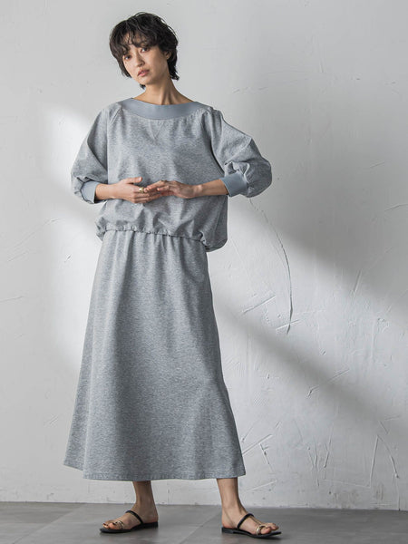 【デザインPOINT】「考えない日の、正解。」着るだけでバランスが整う、スカート・セットアップ。リブ切替えとガゼットステッチがポイントのドロストトップスと、ゆるやかなAラインスカートのデザイン。忙しい日にも迷わず選べる、頼れるアイテム。トップスはコンパクトな丈感、7分袖、ドロストを絞って丸みのあるフォルム。スカートは、広がりすぎないすシルエット、ウエストALLゴム仕様でストレスフリーな穿き心地。セットで、スタイルアップするバランスに仕上げました。【スタイリング】スニーカーでデイリーに、サンダルで女っぽく、シューズでシーンが広がります。単品使いも楽しめるから、旅行にもおすすめ。【素材の特徴】【ライトダンボールジャージー】薄手のダンボールジャージーを使用。適度なハリコシがあり、身体のラインをひろいにくい素材感。カジュアル過ぎない、クリアな表面が魅力。----------------------------------------------------------------洗濯方法家庭洗濯:液温は30℃を限度とし、洗濯機で非常に弱い洗濯ができる。自然乾燥:日陰の吊り干しがよい。アイロン:底面温度120℃を限度としてアイロン仕上げができる。ドライクリーニング:石油系溶剤による弱いドライクリーニングができる。----------------------------------------------------------------■モデル身長 166cm 170cm / 着用サイズ M※画像の商品はサンプルとなりますので実際の商品と仕様、加工、サイズが若干異なる場合がございます。※お客様のモニター環境により実際のお色と多少異なる場合がございます。※撮影状況や光の当たり具合により、色合いが異なって見える場合がございます。関連ワード:MAYSON GREY メイソングレイ レディース 新作 大人コーデ 大人カジュアル 2026春夏 2026SS 春夏 春物 春服 コットン ポリエステル 七分袖 ゴム
