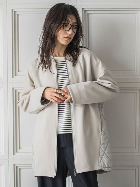 【デザインPOINT】「洒落る、質感コントラストブルゾン。」ダンボールジャージーとキルティングタフタを組み合わせた、質感コントラストが映えるノーカラーブルゾン。気軽に羽織れる、デイリーに頼れる一着です。ラフに羽織れる、ゆとりを持たせたサイジング。前上がりの裾でバランスが取りやすく、ヒップも自然にカバー。身頃や袖を切り替えることでメリハリが付き、すっきり仕上げた衿ぐりが高見えするパターン。【スタイリング】短すぎず、長すぎない、絶妙な丈感がスタイリングの幅を広げてくれる。ボリュームボトムにも、Iラインスカートにも◎【素材の特徴】【ソフトダンボール】ポリエステル/レーヨンのストレッチダンボールを使用。ソフトでなめらかなタッチが心地良いジャージー素材です。----------------------------------------------------------------洗濯方法家庭洗濯:家庭での洗濯禁止。アイロン:アイロン仕上げ禁止。ドライクリーニング:石油系溶剤による弱いドライクリーニングができる。----------------------------------------------------------------■モデル身長 166cm 170cm / 着用サイズ M※画像の商品はサンプルとなりますので実際の商品と仕様、加工、サイズが若干異なる場合がございます。※お客様のモニター環境により実際のお色と多少異なる場合がございます。※撮影状況や光の当たり具合により、色合いが異なって見える場合がございます。関連ワード:MAYSON GREY メイソングレイ レディース 新作 大人コーデ 大人カジュアル 2025秋冬 2025AW 秋冬 秋物 秋服 ノーカラー 合成繊維/ポリエステル レーヨン ポリウレタン