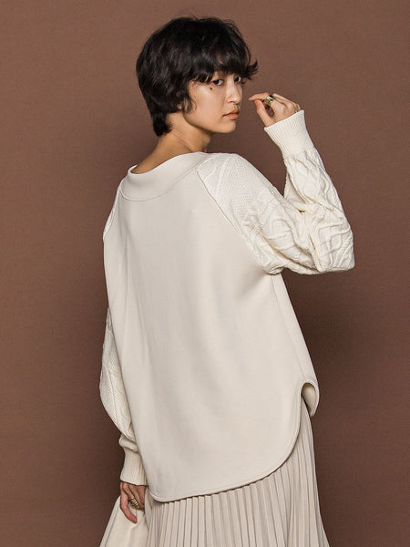 【デザインPOINT】「女っぽさと、質感コントラスト。」メイソングレイが得意とする、ニットドッキング・プルオーバーから、進化デザインが登場。スウェットながらも、ボートネックや立体感あるケーブルニット袖、ラウンドヘムで、女っぽく仕上げました。ほどよいゆとりを持たせた、ボクシーなシルエット。ラグランスリーブにすることで肩馴染み良く、デコルテや袖の丸みを際立たせた拘りのパターン。【スタイリング】コンパクトな丈感は、ワイドパンツやキュロット、スカートと好相性◎ボトムを同系色でまとめた、ワントーンスタイリングもおすすめ。【素材の特徴】【ソフトダンボール×RY/Peストレッチニット】適度なハリコシがありながらも、柔らかなタッチとクリーンな表面が魅力のダンボール素材を使用。ニットは、ケーブル編みでもっちりと立体的に表現。----------------------------------------------------------------洗濯方法家庭洗濯:液温は40℃を限度とし、手洗いができる。自然乾燥:日陰の平干しがよい。アイロン:底面温度120℃を限度としてアイロン仕上げができる。ドライクリーニング:石油系溶剤による弱いドライクリーニングができる。----------------------------------------------------------------■モデル身長 166cm 170cm / 着用サイズ M※画像の商品はサンプルとなりますので実際の商品と仕様、加工、サイズが若干異なる場合がございます。※お客様のモニター環境により実際のお色と多少異なる場合がございます。※撮影状況や光の当たり具合により、色合いが異なって見える場合がございます。関連ワード:MAYSON GREY メイソングレイ レディース 新作 大人コーデ 大人カジュアル 2025秋冬 2025AW 秋冬 秋物 秋服 カットソー ポリエステル レーヨン ナイロン クルーネック 長袖