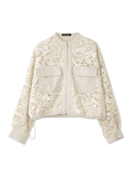 ●POINTナチュラルな質感のボタニカルレースが浮かび上がってみえるノーカラーデザインのZIPブルゾンは、合繊素材特有の光沢があるテキスタイルで切り替えたフラップポケットデザインがポイントです。透け感を軽減し、ドレスダウンすることで、デイリー使いにご着用しやすいように設計されたカーディガン感覚でご着用いただけるフェミニンブルゾンです。裾に仕込んだドローコードでシルエットアレンジが可能です。コンパクトな着丈なので、フレアシルエットのスカートやワイドスラックスなどとも好相性でご着用いただけます。----------------------------------透け感:あり厚さ: やや薄い伸縮性:なし裏地: ありポケット: あり--------------------------------------------------------------------------------------------------洗濯方法家庭洗濯:液温は40℃を限度とし、手洗いができる。自然乾燥:日陰の吊り干しがよい。アイロン:底面温度160℃を限度としてアイロン仕上げができる。ドライクリーニング:石油系溶剤による弱いドライクリーニングができる。----------------------------------------------------------------■モデル身長 165cm 着用サイズ M※画像の商品はサンプルとなりますので実際の商品と仕様、加工、サイズが若干異なる場合がございます。※お客様のモニター環境により実際のお色と多少異なる場合がございます。※撮影状況や光の当たり具合により、色合いが異なって見える場合がございます。関連ワード:QUEENS COURT クイーンズコート レディース 新作 フェミニン 大人コーデ 2026春夏 2026SS 春夏 春物 春服 合成繊維/ポリエステル