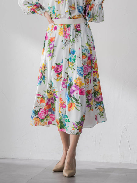 【デザインの特徴】満開の華やかな花々を集めてブーケにした可憐で春らしいプリントスカート。タックフレアーシルエットでたっぷりとした分量感がラグジュアリーな印象です。透け感と光沢感のある軽やかな素材感がエレガントです。ウエストは無地の生地で切り替え、ポイントにしています。単品としても、同素材のブラウスやカーディガンとセットアップで着ていただくと、よりエレガントで華やかな印象です。【素材の特徴】京都の職人の手で描かれた美しいオリジナルプリント。Made in japanの国産生地を使用しています。----------------------------------------------------------------洗濯方法家庭洗濯:液温は30℃を限度とし、手洗いができる。自然乾燥:日陰の吊り干しがよい。アイロン:底面温度160℃を限度としてアイロン仕上げができる。ドライクリーニング:石油系溶剤による弱いドライクリーニングができる。----------------------------------------------------------------■モデル身長 169cm/着用サイズ M※画像の商品はサンプルとなりますので実際の商品と仕様、加工、サイズが若干異なる場合がございます。※お客様のモニター環境により実際のお色と多少異なる場合がございます。※撮影状況や光の当たり具合により、色合いが異なって見える場合がございます。※商品タグに記載されたサイズはヌードサイズです。実際の商品のサイズは商品情報の実寸をご確認ください。関連ワード:Viaggio Blu ビアッジョブルー レディース 新作 大人カジュアル 大人コーデ レディース キレイめ フェミニン エレガント 華やか 上品 春 夏 2026春夏 2026SS 春服 夏服