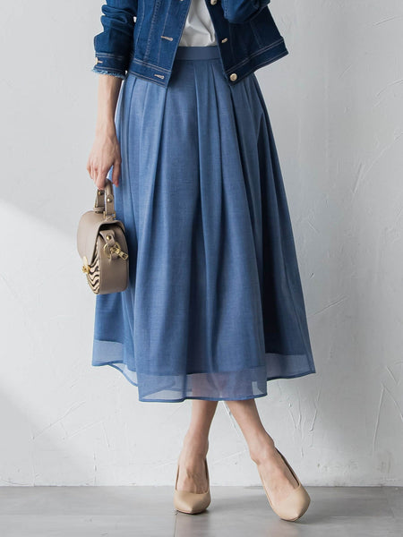 【デザインの特徴】シアーなオーガンンジー素材にデニムのプリントを施した生地を使用したタックフレアースカートです。デニムのシャンブレー感を表現したプリントで、トレンド感もあり、キレイめに着ていただける一着です。デニムプリントですが、光沢のあるシアー素材なので、エレガントな印象です。ウエストベルトは同色系無地使いでポイントに。一枚でも素敵ですが、同素材のブラウス(2613-61166)とセットアップで着ていただくと、より華やかな印象です。【素材の特徴】透け感のある繊細なオーガンジー素材にデニムの素材感をインクジェットプリントをしています。Made in japanの国産生地を使用しています。----------------------------------------------------------------洗濯方法家庭洗濯:液温は40℃を限度とし、洗濯機で弱い洗濯ができる。自然乾燥:日陰の吊り干しがよい。アイロン:底面温度160℃を限度としてアイロン仕上げができる。ドライクリーニング:石油系溶剤による弱いドライクリーニングができる。----------------------------------------------------------------■モデル身長 169cm/着用サイズ M※画像の商品はサンプルとなりますので実際の商品と仕様、加工、サイズが若干異なる場合がございます。※お客様のモニター環境により実際のお色と多少異なる場合がございます。※撮影状況や光の当たり具合により、色合いが異なって見える場合がございます。※商品タグに記載されたサイズはヌードサイズです。実際の商品のサイズは商品情報の実寸をご確認ください。関連ワード:Viaggio Blu ビアッジョブルー レディース 新作 大人カジュアル 大人コーデ レディース キレイめ フェミニン エレガント 華やか 上品 春 夏 2026春夏 2026SS 春服 夏服