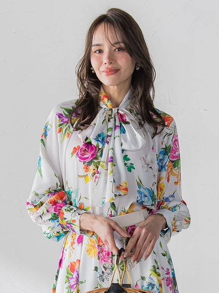 【デザインの特徴】満開の華やかな花々を集めてブーケにした可憐で春らしいプリントブラウスです。ボリュームのあるボウタイは配色のパイピングを施し、チラッと見えるポイントに。光沢のあるシアー素材をギャザーで分量感を出し、ラグジュアリーな一枚に。一枚でも華やかですが、同素材のスカート(2611-61041)とセットアップで着ていただくと、更に華やかさがアップします。【素材の特徴】京都の職人の手で描かれた美しいオリジナルプリント。Made in japanの国産生地を使用しています。----------------------------------------------------------------洗濯方法家庭洗濯:液温は30℃を限度とし、手洗いができる。自然乾燥:日陰の吊り干しがよい。アイロン:底面温度160℃を限度としてアイロン仕上げができる。ドライクリーニング:石油系溶剤による弱いドライクリーニングができる。----------------------------------------------------------------■モデル身長 169cm/着用サイズ M※画像の商品はサンプルとなりますので実際の商品と仕様、加工、サイズが若干異なる場合がございます。※お客様のモニター環境により実際のお色と多少異なる場合がございます。※撮影状況や光の当たり具合により、色合いが異なって見える場合がございます。※商品タグに記載されたサイズはヌードサイズです。実際の商品のサイズは商品情報の実寸をご確認ください。関連ワード:Viaggio Blu ビアッジョブルー レディース 新作 大人カジュアル 大人コーデ レディース キレイめ フェミニン エレガント 華やか 上品 春 夏 2026春夏 2026SS 春服 夏服