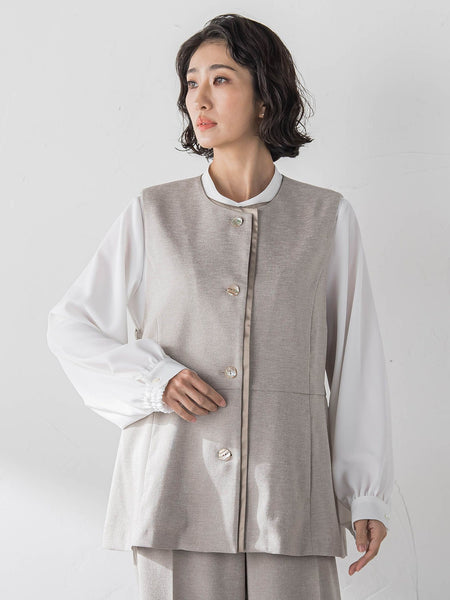 【デザインの特徴】光沢のある麻調合繊素材で仕立てたペプラムジレ。ほんのり広がるシルエットが女性らしく、前立てにのぞくサテンが上品なアクセントに。軽い着心地でレイヤードしやすく、同素材パンツとのセットアップにも対応。きれいめにもカジュアルにも使える一枚です。【機能性】◆Washableご自宅での手洗いが可能◆吸水速乾◆UV◆防シワ【素材の特徴】麻の風合いを持ちながらもシワになりにくく、イージーケア性にも優れ、快適なストレッチ性を持ち合わせた素材です。ほのかなMIX感と微光沢でキレイ目に着用していただける素材感となっております。----------------------------------------------------------------洗濯方法家庭洗濯:液温は40℃を限度とし、手洗いができる。自然乾燥:日陰の吊り干しがよい。アイロン:底面温度120℃を限度としてアイロン仕上げができる。ドライクリーニング:石油系溶剤による弱いドライクリーニングができる。----------------------------------------------------------------■モデル身長 164cm/着用サイズ M※画像の商品はサンプルとなりますので実際の商品と仕様、加工、サイズが若干異なる場合がございます。※お客様のモニター環境により実際のお色と多少異なる場合がございます。※撮影状況や光の当たり具合により、色合いが異なって見える場合がございます。※商品タグに記載されたサイズはヌードサイズです。実際の商品のサイズは商品情報の実寸をご確認ください。関連ワード:la.f… ラ エフ レディース 新作 大人コーデ シンプル フォーマル モード マニッシュ 2026春夏 2026SS 春夏 夏物 夏服