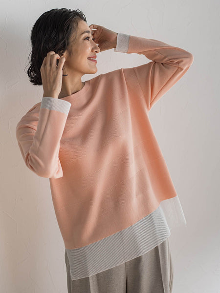 【デザインの特徴】シンプルながらも奥行きのある編地のボーダー柄。袖口と裾にシアー素材の配色編地切替を施すことでレイヤード風のこなれ感が1枚で完成します。ネックは首元がきれいに見える浅めのボートネック。ホールガーメントと呼ばれる縫い代の無い編み方の国内最高峰の工場で作った定評のある美しさ。長いシーズン愛用できるコットンベースの素材。【機能性】◆Washableご自宅での手洗いが可能----------------------------------------------------------------洗濯方法家庭洗濯:液温は40℃を限度とし、手洗いができる。自然乾燥:日陰の平干しがよい。アイロン:底面温度160℃を限度としてアイロン仕上げができる。ドライクリーニング:ドライクリーニング禁止。----------------------------------------------------------------■モデル身長 164cm/着用サイズ M※画像の商品はサンプルとなりますので実際の商品と仕様、加工、サイズが若干異なる場合がございます。※お客様のモニター環境により実際のお色と多少異なる場合がございます。※撮影状況や光の当たり具合により、色合いが異なって見える場合がございます。※商品タグに記載されたサイズはヌードサイズです。実際の商品のサイズは商品情報の実寸をご確認ください。関連ワード:la.f… ラ エフ レディース 新作 大人コーデ シンプル フォーマル モード マニッシュ 2026春夏 2026SS 春夏 春物 春服