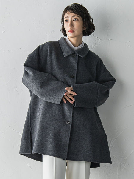 【デザインの特徴】上質な二重織ウールをリバー仕立てで仕上げた、スタンドカラーのミドルレングスコート。ゆったりとしたシルエットが抜け感を生み、リラックスした着心地ながらも、立ち上がる衿元がほどよいシャープさをプラスします。リバーコートにはめずらしい裏地付きで、着脱もスムーズに。長すぎない丈感はバランスが取りやすく、パンツにもスカートにも合わせやすい一枚。きちんと感と今っぽい余裕をあわせ持った、大人のための万能コートです。【素材の特徴】オーストラリア産タスマニア原料のスーパー140ウールとスーパー120ウールをブレンドした非常に上質なウールを使用。しなやかな滑り感とソフトなタッチ、上質な光沢感を兼ね備えたウールリバー素材になります。生地一枚でコートを仕上げることができるため、軽さを実現しつつ、生地と生地を接結したリバー素材であるがゆえの(生地と生地の間に空気の層をつくることができる)温かさももちあわせた製品に仕上がっています。必要な部分にふらして裏地を使用することにより、リバーコート特有の袖通りの悪い着用のしにくさを解消した製品となっております。----------------------------------------------------------------洗濯方法家庭洗濯:家庭での洗濯禁止。アイロン:底面温度120℃を限度としてアイロン仕上げができる。ドライクリーニング:石油系溶剤による弱いドライクリーニングができる。----------------------------------------------------------------※画像の商品はサンプルとなりますので実際の商品と仕様、加工、サイズが若干異なる場合がございます。※お客様のモニター環境により実際のお色と多少異なる場合がございます。※撮影状況や光の当たり具合により、色合いが異なって見える場合がございます。※商品タグに記載されたサイズはヌードサイズです。実際の商品のサイズは商品情報の実寸をご確認ください。関連ワード:la.f… ラ エフ レディース 新作 大人コーデ シンプル フォーマル モード マニッシュ 2025秋冬 2025AW 秋冬 秋物 秋服