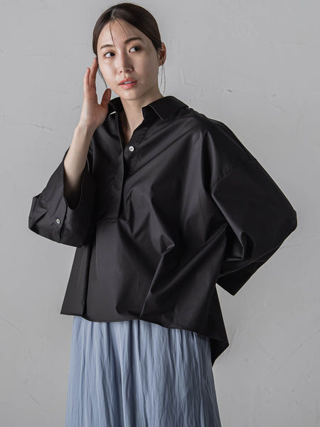 【デザインの特徴】フロントをタックインしたようなバルーンデザインのオーバーサイズシャツ。襟元はすっきりとしたスキッパーデザインで、モダンな中にもクールな印象をプラス。やや艶感のあるシャツ地を使用することで、エレガント感をプラスしています。【機能性】◆接触冷感ひんやりとしたタッチで夏でも快適な着心地◆紫外線防止紫外線をカットしてくれるので、着るだけで紫外線対策が叶います【素材の特徴】超長綿とダルポリエステルの混紡による接触冷感性とUVカット効果があります。最終工程で樹脂光沢加工を施すことにより、滑らかな光沢感を表現しております。----------------------------------洗濯方法家庭洗濯:液温は40℃を限度とし、洗濯機で弱い洗濯ができる。自然乾燥:日蔭の吊り干しがよい。アイロン:底面温度150℃を限度としてアイロン仕上げができる。ドライクリーニング:石油系溶剤による弱いドライクリーニングができる。----------------------------------■モデル1 身長 173cm/着用サイズ 9号■モデル2 身長 171cm/着用サイズ 9号※画像の商品はサンプルとなりますので実際の商品と仕様、加工、サイズが若干異なる場合がございます。※お客様のモニター環境により実際のお色と多少異なる場合がございます。※撮影状況や光の当たり具合により、色合いが異なって見える場合がございます。※商品タグに記載されたサイズはヌードサイズです。実際の商品のサイズは商品情報の実寸をご確認ください。関連ワード:la.f… ラ エフ 2024秋冬 2024AW 秋 秋服 ブラウス コットン ポリエステル 無地 長袖 シンプル フォーマル モード マニッシュ オーバーサイズ シャツ
