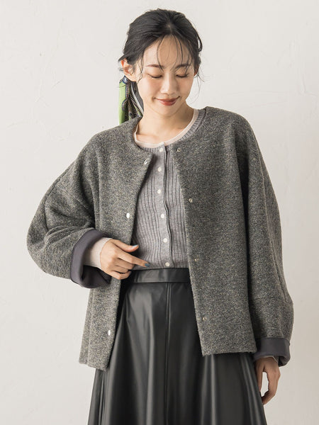 イタリアの生地メーカーで作られたインポートのスライバー素材を使用した、驚くほど軽い着心地が魅力のジャケット。今年は裏側にボンディングを施し、ほんのり張りが出ることでよりこなれ感のあるフォルムにアップデートしました。温かみのある素材感とラメが羽織るだけで旬なムードに仕上げてくれる1枚です。中にニットなどを合わせやすい程良くゆるいサイズ感で、シンプルながらも袖のフォルムや、袖口を折り返してバイカラーをのぞかせるアレンジも自在です。スカートからパンツまでどんなボトムスにも合わせやすい丈バランスです。----------------------------------------------------------------洗濯方法家庭洗濯:家庭での洗濯禁止。アイロン:底面温度120℃を限度としてアイロン仕上げができる。ドライクリーニング:石油系溶剤による弱いドライクリーニングができる。----------------------------------------------------------------※画像の商品はサンプルとなりますので実際の商品と仕様、加工、サイズが若干異なる場合がございます。※お客様のモニター環境により実際のお色と多少異なる場合がございます。※撮影状況や光の当たり具合により、色合いが異なって見える場合がございます。※商品タグに記載されたサイズはヌードサイズです。実際の商品のサイズは商品情報の実寸をご確認ください。関連ワード:Droitelautreamont ドロワットロートレアモン レディース 新作 トレンド 大人フェミニン 2025秋冬 2025AW 秋冬 秋物 秋服 ノーカラー シンプル キレカジ 綿/コットン 合成繊維/ポリエステル ウール アクリル ブルゾン