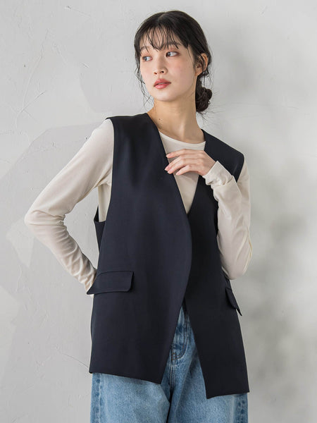 首周りをすっきりと見せるVネックとレイヤードするだけで着こなしの鮮度を高める、羽織るタイプのボクシーなベスト。ラフに着ていただくため、前はあえて留めないすっきりとした仕様で、ヒップラインまできれいにカバーする絶妙な丈感にしています。今回はシックな定番の<ネイビー>、お洒落でモードな印象の<グレー>で展開しています。同シリーズのパンツと合わせてセットアップ風に着こなせば、フォーマルなシーンにも対応可能。ボトム次第でオンオフ問わず活躍します。ストレッチツイル素材を使用しているため、程よい落ち感、適度なハリ感も兼ね備えています。光沢感と肌触り、ストレッチ性にこだわった素材を使用しています。----------------------------------------------------------------洗濯方法家庭洗濯:液温は40℃を限度とし、手洗いができる。自然乾燥:日蔭の吊り干しがよい。アイロン:底面温度120℃を限度としてアイロン仕上げができる。ドライクリーニング:ドライクリーニング禁止。----------------------------------------------------------------※画像の商品はサンプルとなりますので実際の商品と仕様、加工、サイズが若干異なる場合がございます。※お客様のモニター環境により実際のお色と多少異なる場合がございます。※撮影状況や光の当たり具合により、色合いが異なって見える場合がございます。※商品タグに記載されたサイズはヌードサイズです。実際の商品のサイズは商品情報の実寸をご確認ください。関連ワード:Droitelautreamont ドロワットロートレアモン レディース 新作 トレンド 大人フェミニン 2026春夏 2026SS 春夏 春物 春服 合成繊維/ポリエステル ポリウレタン ジレ