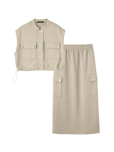 ●POINTクリーンな見た目で、程よくハリ・落ち感があり、クッションのようなふんわりと柔らかい肌触りのダンボールニット素材を使用しています。伸縮性があり、扱いやすいイージーケア素材です。フラップポケットデザインが印象的なベストとIラインスカートの2ピースアイテムです。ベストは裾にドローコードが仕込まれて、シルエット変化が可能です。気温が低い日にはインナーを仕込んで、気温が高くなってきたら1枚で、などコーディネートによってロングシーズンご着用が可能です。また、単品での着回しにも重宝し、着こなしの幅を広げる嬉しい2ピースです。同素材を使用したシリーズにダンボールニットスキッパートップ×スカート2ピース(4101-60013)がございます。----------------------------------透け感:淡色のみややあり厚さ: やや厚い伸縮性:あり裏地: なしポケット: あり--------------------------------------------------------------------------------------------------洗濯方法家庭洗濯:液温は30℃を限度とし、洗濯機で非常に弱い洗濯ができる。自然乾燥:日陰の吊り干しがよい。アイロン:底面温度120℃を限度としてアイロン仕上げができる。ドライクリーニング:石油系溶剤による弱いドライクリーニングができる。----------------------------------------------------------------■モデル身長 165cm 着用サイズ M※画像の商品はサンプルとなりますので実際の商品と仕様、加工、サイズが若干異なる場合がございます。※お客様のモニター環境により実際のお色と多少異なる場合がございます。※撮影状況や光の当たり具合により、色合いが異なって見える場合がございます。関連ワード:ketty ケティ レディース 新作 大人コーデ 2026春夏 2026SS 春夏 春物 春服 Iライン 無地 ノースリーブ 合成繊維/ポリエステル レーヨン ベスト ニット オフィス 旅行 デート 通勤 ホテルディナー アフタヌーンティー