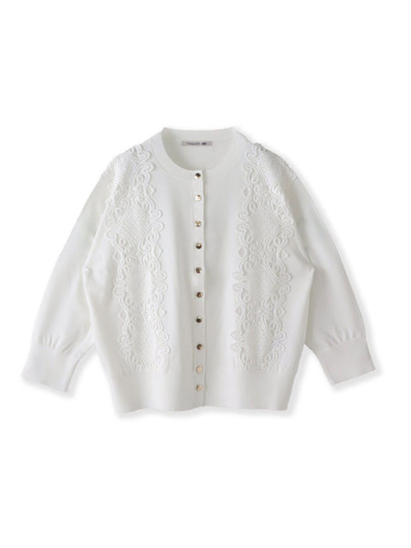 前身頃を繊細なレース刺繍で切り替えた、華やかカーディガン。
