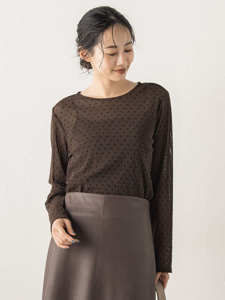 チュール素材に小さめのフロッキードットをプリントしたプルオーバー。ソフトな肌触りのラメを加え、華やかで今年らしいムードにアップデート。透け過ぎないチュールが合わせやすく、伸縮性があり着心地の良さもポイントです。タイト過ぎず1枚でも着やすいサイズ感に仕上げました。ジャケットインだけでなくニットベストやジャンスカの中に合わせるだけでさりげなく華やかさをプラスしてくれる万能な1枚です。----------------------------------------------------------------洗濯方法家庭洗濯:液温は40℃を限度とし、手洗いができる。自然乾燥:日蔭の吊り干しがよい。アイロン:底面温度120℃を限度としてアイロン仕上げができる。ドライクリーニング:石油系溶剤による弱いドライクリーニングができる。----------------------------------------------------------------※画像の商品はサンプルとなりますので実際の商品と仕様、加工、サイズが若干異なる場合がございます。※お客様のモニター環境により実際のお色と多少異なる場合がございます。※撮影状況や光の当たり具合により、色合いが異なって見える場合がございます。※商品タグに記載されたサイズはヌードサイズです。実際の商品のサイズは商品情報の実寸をご確認ください。関連ワード:Droitelautreamont ドロワットロートレアモン レディース 新作 トレンド 大人フェミニン 2025秋冬 2025AW 秋冬 秋物 秋服 カットソー コットン ポリエステル レーヨン ポリウレタン ナイロン クルーネック カジュアル スウィート シンプル ナチュラル キレカジ フェミニン ドット・水玉 長袖