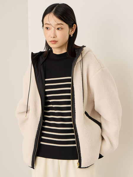 ●POINT密度の高い肉感のあるボア素材を使用し、微光沢感のあるテキスタイルで切り替えたフーディブルゾンです。フードから垂れ下がるコードデザインも華奢なナローコードでシックな印象をプラスします。また、着ぶくれ感を抑えるコクーンライクな丸みを感じられるパターンで、大人のカジュアルスタイルを底上げする一枚です。後身頃から袖先にかけてパイピングを施し、バックスタイルも抜かりなくモードエッセンスをプラス。サテンやシアー感のあるテキスタイルスカートをあわせて、質感のコントラストを楽しむコーディネートがおすすめです。----------------------------------透け感:なし厚さ: 厚い伸縮性:あり裏地: ありポケット: あり--------------------------------------------------------------------------------------------------洗濯方法家庭洗濯:家庭での洗濯禁止。アイロン:アイロン仕上げ禁止。ドライクリーニング:石油系溶剤による弱いドライクリーニングができる。----------------------------------------------------------------■モデル身長 165cm 着用サイズ M※画像の商品はサンプルとなりますので実際の商品と仕様、加工、サイズが若干異なる場合がございます。※お客様のモニター環境により実際のお色と多少異なる場合がございます。※撮影状況や光の当たり具合により、色合いが異なって見える場合がございます。関連ワード:ketty ケティ レディース 新作 大人コーデ 2025秋冬 2025AW 秋冬 秋物 秋服 合成繊維/ポリエステル ナイロン オフィス 旅行 デート 通勤 ホテルディナー アフタヌーンティー