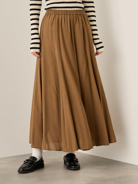 ウエストはぐるりゴム仕様、ウエストからギャザーが入ってイージーな履き心地ですが、動くたびに膝上から裾に向かって広がり、軽やかに揺れるフローイングシルエットが美しい一枚です。