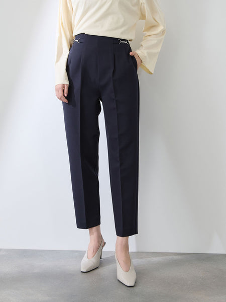 バックウエスト部分がゴム仕様でイージーな履き心地なのに、ウエスト両サイド部分にメタルカラーのビットが配置されてリッチ感をプラス。