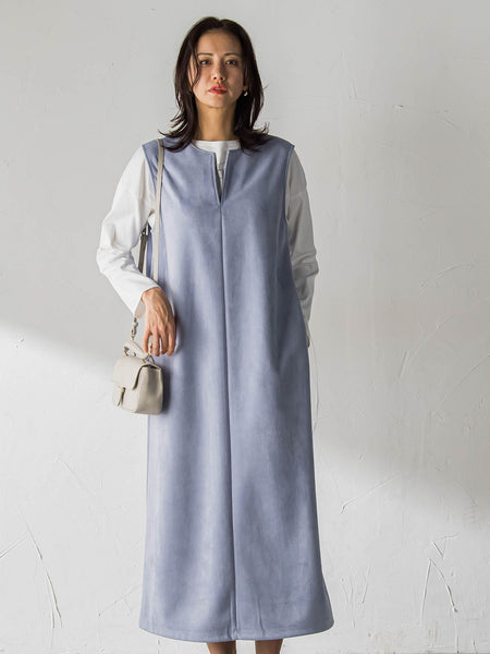 【デザイン】すとんと落ちるストレートシルエットが上品なフェイクスエードのジャンパースカート。ストレッチ性があり動きやすく、ゆとりのある設計でボディラインを拾いにくいのが特徴です。顔まわりをすっきり見せるキーネックで、インナー次第で雰囲気を変えながら着用いただけます。【素材】やわらかくしなやかなフェイクスエード素材を使用。ほどよい厚みとマットな質感で、シンプルでもきれい見えする一枚です。ストレッチが効いており、長時間の着用でも快適。手洗い可能で日常使いしやすいイージーケア素材です。※濃色は色移り防止のため、単独洗いを推奨しています。【スタイリング】タートル、ブラウス、薄手ニットなど、合わせるインナーによって印象が変わり、ロングシーズン活躍。ブーツできれいめにも、スニーカーでカジュアルにも対応します。【仕様】裏地なし/ポケットあり/後ろベンツあり(しつけ糸付き)