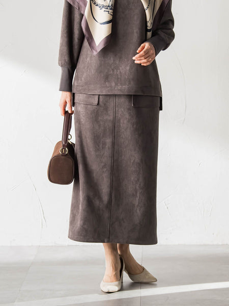 【デザイン】同素材プルオーバー・ワンピースとセットアップで着られるフェイクスエードのナロースカート。すっきりとしたナローシルエットながら、体のラインを拾いにくい絶妙な分量に仕上げています。後ろウエストはゴム仕様でラクな穿き心地。左脇ファスナーで着脱しやすく、シンプルながらも細部まで使いやすさにこだわった一枚です。裾にはベンツ開き(しつけ糸あり)を入れ、歩きやすさと上品な印象を両立。ポケット付きなのも嬉しいポイントです。【素材】柔らかな風合いと上品な表面感が魅力のフェイクスエード素材。ストレッチが効いており、動きやすく快適に着用いただけます。【仕様】裏地なし後ろウエストゴム左脇ファスナーあきポケットあり裾ベンツあき(しつけ糸あり)