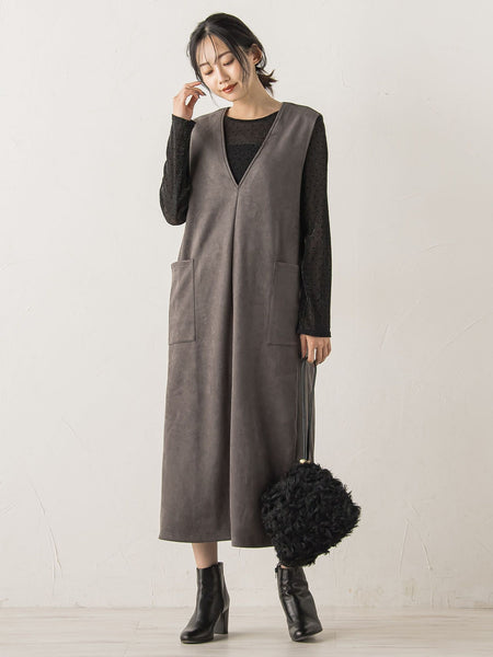 この秋トレンドのフェイクスエードを使用したシーズンの始めにおすすめなジャンスカ。サイドのニットリブ切替えがさりげないデザインポイントに。シンプルなシルエットにすっきりとしたVネックで、リブニットやブラウス合わせまでレイヤードスタイルに着回しやすい1枚です。カジュアルになりがちなスエードを落ち着いた雰囲気で着こなせるカラーにも拘りました。着るだけで今年らしい印象にアップデートしてくれる1枚です。----------------------------------------------------------------洗濯方法家庭洗濯:液温は40℃を限度とし、手洗いができる。自然乾燥:日蔭の吊り干しがよい。アイロン:アイロン仕上げ禁止。ドライクリーニング:石油系溶剤による弱いドライクリーニングができる。----------------------------------------------------------------※画像の商品はサンプルとなりますので実際の商品と仕様、加工、サイズが若干異なる場合がございます。※お客様のモニター環境により実際のお色と多少異なる場合がございます。※撮影状況や光の当たり具合により、色合いが異なって見える場合がございます。※商品タグに記載されたサイズはヌードサイズです。実際の商品のサイズは商品情報の実寸をご確認ください。関連ワード:Droitelautreamont ドロワットロートレアモン レディース 新作 トレンド 大人フェミニン 2025秋冬 2025AW 秋冬 秋物 秋服 ノースリーブ 合成繊維/ポリエステル