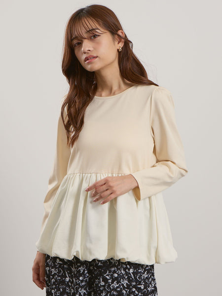 ●POINT程よく肉感の感じられるシルキータッチのジャージー(カットソー)素材を使用し、ワッシャータフタ素材で切り替えバルーンヘムデザインにしたプルオーバーです。変型ペプラムラインのトップスなので、Iラインスカートやテーパードなどレッグラインに寄り添うシルエットのボトムスをあわせていただくとバランスよくご着用いただけます。コーディネートを考えることなくこれ一枚で旬のルックが完成するデザイントップスです。----------------------------------透け感:淡色のみややあり厚さ: 普通伸縮性:あり裏地: なしポケット: なし--------------------------------------------------------------------------------------------------洗濯方法家庭洗濯:液温は40℃を限度とし、手洗いができる。自然乾燥:日陰の吊り干しがよい。アイロン:底面温度120℃を限度としてアイロン仕上げができる。ドライクリーニング:石油系溶剤による弱いドライクリーニングができる。----------------------------------------------------------------■モデル身長 165cm 着用サイズ M※画像の商品はサンプルとなりますので実際の商品と仕様、加工、サイズが若干異なる場合がございます。※お客様のモニター環境により実際のお色と多少異なる場合がございます。※撮影状況や光の当たり具合により、色合いが異なって見える場合がございます。関連ワード:QUEENS COURT クイーンズコート レディース 新作 フェミニン 大人コーデ 2025秋冬 2025AW 秋冬 秋物 秋服 カットソー コットン ポリエステル