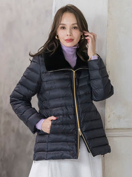 【デザインの特徴】ファー衿デザインのエレガントなダウン。衿の内側にはミンク調のエコファーを使用しているのでファスナーを上まで閉じたらマフラー代わりにもなるデザインです。光沢のある生地を使用し、ステッチの間隔を細めにすることでエレガントで大人っぽい印象に仕上げています。脇の裾にはコンシールファスナーを施し、開けることでスリット風に着こなしていただけるのでボリュームボトムとも好相性に着こなしていただけます。シンプルながら華やかなデザインが光る1着です。----------------------------------------------------------------洗濯方法家庭洗濯:家庭での洗濯禁止。アイロン:アイロン仕上げ禁止。ドライクリーニング:石油系溶剤による弱いドライクリーニングができる。----------------------------------------------------------------■モデル身長 169cm/着用サイズ M※画像の商品はサンプルとなりますので実際の商品と仕様、加工、サイズが若干異なる場合がございます。※お客様のモニター環境により実際のお色と多少異なる場合がございます。※撮影状況や光の当たり具合により、色合いが異なって見える場合がございます。※商品タグに記載されたサイズはヌードサイズです。実際の商品のサイズは商品情報の実寸をご確認ください。関連ワード:Viaggio Blu ビアッジョブルー レディース 新作 大人カジュアル 大人コーデ レディース キレイめ フェミニン エレガント 華やか 上品 秋 秋服 2025AW AW 2025秋冬
