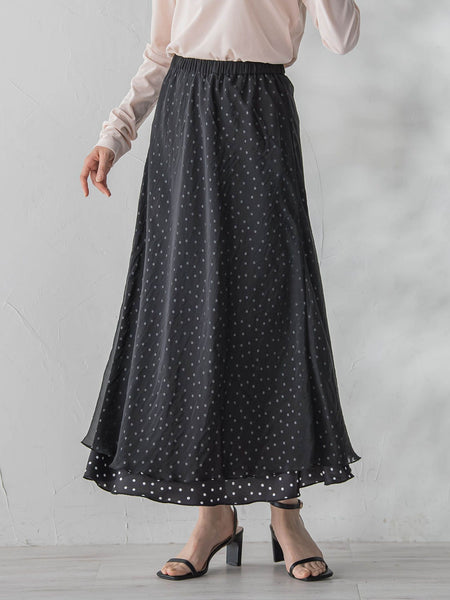 レイヤードのデザインが特徴の大人フェミニンに着こなせるスカート。光沢のあるサテン素材にオーガンジーをレイヤードしたデザイン。ドット柄はオーガンジーと重なっていることで甘くなりすぎず、さりげないアクセントに。後はゴム仕様で、窮屈感のない穿き心地です。すっきりとした腰回りから、裾に向かっているマーメイドシルエットが女性らしい印象。ニット合わせもおすすめですが、オールシーズン使用できるので着回し力も抜群です。----------------------------------------------------------------洗濯方法家庭洗濯:液温は40℃を限度とし、手洗いができる。自然乾燥:日蔭の吊り干しがよい。アイロン:底面温度120℃を限度としてアイロン仕上げができる。ドライクリーニング:石油系溶剤による弱いドライクリーニングができる。----------------------------------------------------------------※画像の商品はサンプルとなりますので実際の商品と仕様、加工、サイズが若干異なる場合がございます。※お客様のモニター環境により実際のお色と多少異なる場合がございます。※撮影状況や光の当たり具合により、色合いが異なって見える場合がございます。※商品タグに記載されたサイズはヌードサイズです。実際の商品のサイズは商品情報の実寸をご確認ください。関連ワード:Droitelautreamont ドロワットロートレアモン レディース 新作 トレンド 大人フェミニン 2026春夏 2026SS 春夏 春物 春服 ポリエステル ナイロン 無地 ゴム フレアスカート