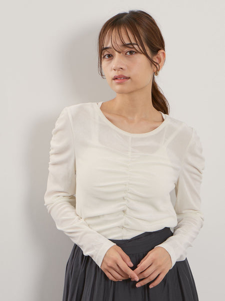 ●POINT軽やかな透け感のあるベロア素材を使用したギャザーデザインのプルオーバーです。毛足感のある素材なので、密度が高くなると一気にウォーム感を感じる素材ですが、近年の夏の長期化にあわせて人気の高い素材になっています。ベロア素材特有のシックな光沢感をいかして、フロントにギャザーを寄せて立体的なデザインへと変化。デイリー使いに限らず、あわせのボトムスによってカジュアルなパーティシーンでもご着用が可能なプルオーバーです。----------------------------------透け感:ややあり厚さ: 普通伸縮性:あり裏地: なしポケット: なし--------------------------------------------------------------------------------------------------洗濯方法家庭洗濯:液温は40℃を限度とし、手洗いができる。自然乾燥:日陰の吊り干しがよい。アイロン:アイロン仕上げ禁止。ドライクリーニング:石油系溶剤による弱いドライクリーニングができる。----------------------------------------------------------------■モデル身長 165cm 着用サイズ M※画像の商品はサンプルとなりますので実際の商品と仕様、加工、サイズが若干異なる場合がございます。※お客様のモニター環境により実際のお色と多少異なる場合がございます。※撮影状況や光の当たり具合により、色合いが異なって見える場合がございます。関連ワード:QUEENS COURT クイーンズコート レディース 新作 フェミニン 大人コーデ 2025秋冬 2025AW 秋冬 秋物 秋服 カットソー ポリエステル 無地 長袖 ベロア