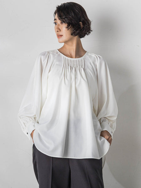 【デザインの特徴】ピンタックをたっぷりあしらったブラウス。一枚できまるふわりとしたシルエットに、レイヤードしても使いやすいゆったりと広がるボリュームスリーブで、マルチに使えるデザイン性。【素材の特徴】フルダルのスパンを起毛し、抑えをかけて光沢を出しました。決してふかつくことはなく、サラッとした梳毛ライクの滑らかな手触りでいて、イージーケア。優しい肌触りの素材となっております。----------------------------------洗濯方法家庭洗濯:液温は40℃を限度とし、洗濯機で弱い洗濯ができる。自然乾燥:日蔭の吊り干しがよい。アイロン:底面温度150℃を限度としてアイロン仕上げができる。ドライクリーニング:石油系溶剤による弱いドライクリーニングができる。----------------------------------■モデル1 身長 173cm/着用サイズ 9号■モデル2 身長 171cm/着用サイズ 9号※画像の商品はサンプルとなりますので実際の商品と仕様、加工、サイズが若干異なる場合がございます。※お客様のモニター環境により実際のお色と多少異なる場合がございます。※撮影状況や光の当たり具合により、色合いが異なって見える場合がございます。※商品タグに記載されたサイズはヌードサイズです。実際の商品のサイズは商品情報の実寸をご確認ください。関連ワード:la.f… ラ エフ 2024秋冬 2024AW 秋 秋服 ブラウス ポリエステル クルーネック 無地 長袖 シンプル フォーマル モード マニッシュ