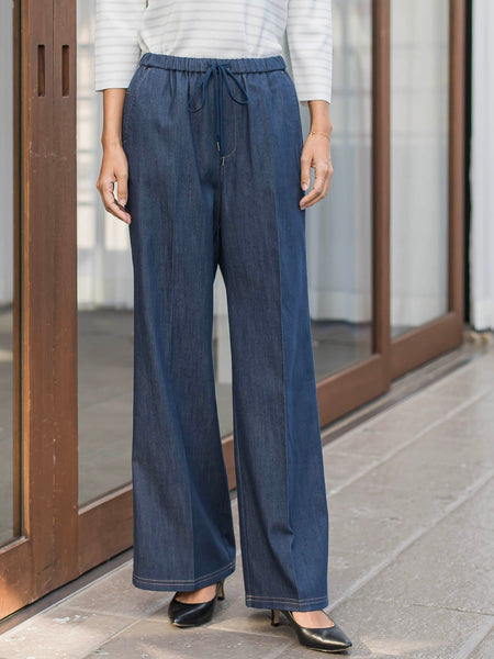 【デザインの特徴】色落ちしにくい反応染料を使用した、きれいめ仕立てのワイドデニム。上品な発色とハリのある風合いで、大人らしいクリーンな印象に。脚のラインをまっすぐ見せるシルエットで、カジュアルにもきれいめにも合わせやすい万能ボトムです。【素材の特徴】◆Easy Careご自宅でのお手入れが簡単【素材の特徴】綿混のセルロース使いのデニムになります。程よい落ち感がありきれいな見え感が特徴の色落ちしにくいデニム素材となっております。やわらかなタッチとストレッチ性で快適に着用していただけます。----------------------------------------------------------------洗濯方法家庭洗濯:液温は30℃を限度とし、洗濯機で非常に弱い洗濯ができる。自然乾燥:日陰の吊り干しがよい。アイロン:底面温度120℃を限度としてアイロン仕上げができる。ドライクリーニング:石油系溶剤による弱いドライクリーニングができる。----------------------------------------------------------------■モデル身長 164cm/着用サイズ M※画像の商品はサンプルとなりますので実際の商品と仕様、加工、サイズが若干異なる場合がございます。※お客様のモニター環境により実際のお色と多少異なる場合がございます。※撮影状況や光の当たり具合により、色合いが異なって見える場合がございます。※商品タグに記載されたサイズはヌードサイズです。実際の商品のサイズは商品情報の実寸をご確認ください。関連ワード:la.f… ラ エフ レディース 新作 大人コーデ シンプル フォーマル モード マニッシュ 2026春夏 2026SS 春夏 春物 春服