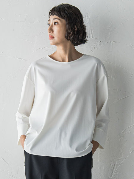 【デザインの特徴】後ろが艶やかなサテン生地に切り替えられたシンプルで着まわしのきくプルオーバー。センターバックの開き見せデザインがポイントです。1枚着としては勿論ですがジャケットやジレのインナーとしても着回ししやすく、ボトムを選ばず様々なコーディネイトをお楽しみいただけます。しなやかでソフトな風合いで肌触りの良さも◎【機能性】◆Easy Careご自宅でのお手入れが簡単◆接触冷感◆紫外線防止 【素材の特徴】セルロース素材の微光沢としなやかでソフトな風合い、ハイゲージのきれいな目面とハリ感が融合した素材です。適度な肉感と軽さがあり体のラインを気にせず安心して着用できる素材感で、キックバックにすぐれ快適に着用していただける素材となっております。----------------------------------------------------------------洗濯方法家庭洗濯:液温は30℃を限度とし、洗濯機で非常に弱い洗濯ができる。自然乾燥:日陰の吊り干しがよい。アイロン:底面温度120℃を限度としてアイロン仕上げができる。ドライクリーニング:石油系溶剤による弱いドライクリーニングができる。----------------------------------------------------------------※画像の商品はサンプルとなりますので実際の商品と仕様、加工、サイズが若干異なる場合がございます。※お客様のモニター環境により実際のお色と多少異なる場合がございます。※撮影状況や光の当たり具合により、色合いが異なって見える場合がございます。※商品タグに記載されたサイズはヌードサイズです。実際の商品のサイズは商品情報の実寸をご確認ください。関連ワード:la.f… ラ エフ レディース 新作 大人コーデ シンプル フォーマル モード マニッシュ 2025秋冬 2025AW 秋冬 秋物 秋服
