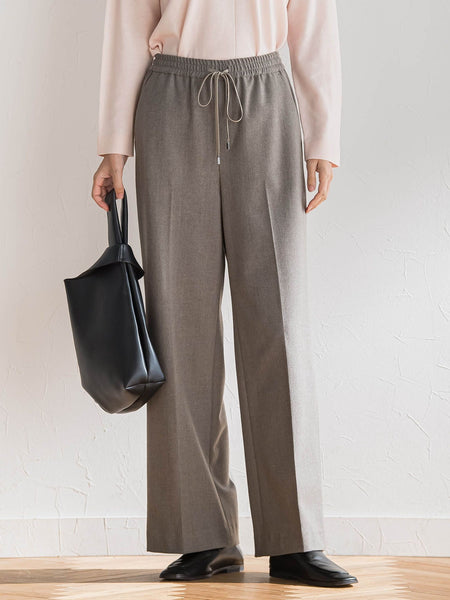 【デザインの特徴】表も裏も起毛をかけた、ふんわりとした肌ざわりが魅力のあたたかパンツ。ほどよいハリ感がありながら、身体をやさしく包み込むような着心地にこだわりました。ゆとりのあるワイドシルエットながら、センタープレスを施すことで、縦のラインが強調されてすっきりとした印象に。ウエストは総ゴム仕様で、着脱しやすく一日中らくちん。シンプルなニットやブラウスと合わせるだけで、きちんと感のある大人の冬コーデが完成します。【機能性】◆Easy Careご自宅でのお手入れが簡単【素材の特徴】ラエフブランドオリジナルの織り、整理ともに尾州産地で仕上げた着用感抜群の2WAYストレッチ素材になります。タテヨコ糸ともに通常より高密度の規格で織り上げ、仕立て映えの良さと着用時の安心感を生み出し、整理加工においても生地を縮ませ通常の2WAYに比べより人の動きに呼応すべくタテ伸び重視で仕上げたハイパワーストレッチになります。こだわりの両面起毛により、ソフトで肌触りの良い素材感を実現。今シーズンのシロは経糸、緯糸ともにフルダルの糸を使用し従来よりもより透けにくい素材となっております。洗濯機で洗えるイージーケアも嬉しいポイント。また生地の表裏、両面にマイクロピーチ加工を施し、風合いに温かみがあり、非常に肌触りのよい製品に仕上がっています。----------------------------------------------------------------洗濯方法家庭洗濯:液温は30℃を限度とし、洗濯機で非常に弱い洗濯ができる。自然乾燥:日陰の吊り干しがよい。アイロン:底面温度120℃を限度としてアイロン仕上げができる。ドライクリーニング:石油系溶剤による弱いドライクリーニングができる。----------------------------------------------------------------※画像の商品はサンプルとなりますので実際の商品と仕様、加工、サイズが若干異なる場合がございます。※お客様のモニター環境により実際のお色と多少異なる場合がございます。※撮影状況や光の当たり具合により、色合いが異なって見える場合がございます。※商品タグに記載されたサイズはヌードサイズです。実際の商品のサイズは商品情報の実寸をご確認ください。関連ワード:la.f… ラ エフ レディース 新作 大人コーデ シンプル フォーマル モード マニッシュ 2025秋冬 2025AW 秋冬 秋物 秋服
