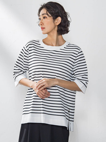 【デザインの特徴】3612-52021のボーダーバージョン。繊細なラメを使用し品の良い輝きが、カジュアルなボーダースタイルに差をつけてくれます。【機能性】◆Washableご自宅での手洗いが可能----------------------------------------------------------------洗濯方法家庭洗濯:液温は30℃を限度とし、手洗いができる。自然乾燥:日蔭の平干しがよい。アイロン:底面温度120℃を限度としてアイロン仕上げができる。ドライクリーニング:石油系溶剤による弱いドライクリーニングができる。----------------------------------------------------------------※画像の商品はサンプルとなりますので実際の商品と仕様、加工、サイズが若干異なる場合がございます。※お客様のモニター環境により実際のお色と多少異なる場合がございます。※撮影状況や光の当たり具合により、色合いが異なって見える場合がございます。※商品タグに記載されたサイズはヌードサイズです。実際の商品のサイズは商品情報の実寸をご確認ください。関連ワード:la.f… ラ エフ 2025春夏 2025SS 春 春服 ミドル丈 ニット ポリエステル レーヨン ナイロン ボーダー シンプル フォーマル モード マニッシュ ラメ 気温15度~20度におすすめ