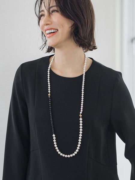 大小異なるコットンパールの間に、天然石:ブラックオニキスをあしらった高級感のあるネックレス。ツヤパールではなくコットンパールを使用することでより女性らしく、大人のオケージョンネックレスに仕上げています。また、マグネットでの2WAY仕様になっており、ロングでの着用も、ショートでの着用も手軽にできるため、シーンと気分に合わせたコーデが可能なネックレスです。カットされたオニキスがポイントになっているので、きれいめなオケージョンスタイルにも、ショート使いで普段にも、マルチに活躍してくれるジュエリーです。【2022LAセレモニー】