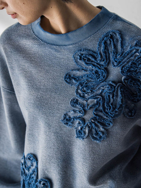 【デザインPOINT】「無造作にほころぶ、フラワースウェット」立体的なドローイング・フラワーモチーフに心浮き立つ、スウェットプルオーバー。モチーフは、共生地断ち切り+洗い加工で甘さを抑え、ラフな表情に仕上げました。コンパクトな丈感と、カーヴィな丸みの ある袖が、女性らしいパターン。ほどよいゆとりのある、リラックスシルエット。襟ぐり・袖口・裾はRIB切替えで、ストレッチ性と耐久性を考慮。【スタイリング】キュロット、カーブパンツ、ボリュームのあるボトムと好相性。デニムでカジュアルに、きれいめパンツでモードにもふれる一枚。【素材の特徴】【裏毛360g/顔料染め裏毛】白は360g裏毛をウォッシュ加工、ブルーは顔料染め裏毛にハイブリーチ加工。裏毛のパイル面を表使いすることで、凹凸感のあるこなれた印象を演出。----------------------------------------------------------------洗濯方法家庭洗濯:液温は30℃を限度とし、洗濯機で非常に弱い洗濯ができる。自然乾燥:日陰の吊り干しがよい。アイロン:底面温度120℃を限度としてアイロン仕上げができる。ドライクリーニング:石油系溶剤による弱いドライクリーニングができる。----------------------------------------------------------------■モデル身長 166cm 170cm / 着用サイズ M※画像の商品はサンプルとなりますので実際の商品と仕様、加工、サイズが若干異なる場合がございます。※お客様のモニター環境により実際のお色と多少異なる場合がございます。※撮影状況や光の当たり具合により、色合いが異なって見える場合がございます。関連ワード:MAYSON GREY メイソングレイ レディース 新作 大人コーデ 大人カジュアル 2026春夏 2026SS 春夏 春物 春服 スウェット コットン ポリエステル クルーネック 花・植物 長袖