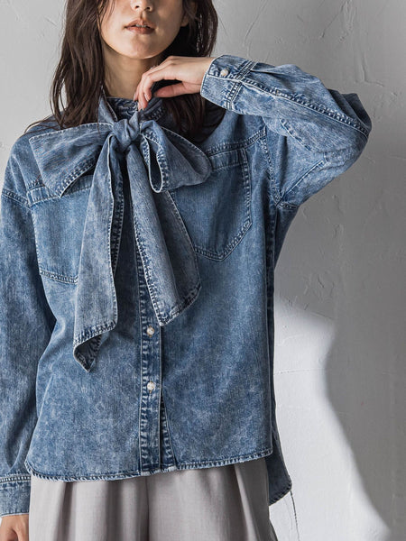 【デザインPOINT】「ラフに華やぐ、デニムシャツ。」加工感のあるデニムシャツに、ボウタイの華やぎをプラス。ボウタイは結び方で印象が変わり、顔まわりを華やかに演出。着るだけで抜け感のあるムードの、オーバーサイズ・シルエット。ボウタイは、後中央釦で取り外し可能。両胸のポケットが目線を上げ、バンドカラーが端正な印象のパターン。【スタイリング】きれいめパンツと合わせたMIXコーデや、デニムonデニムのラフな着こなしがおすすめ。すっきりとしたバンドカラーシャツとしても、羽織りとしても着用可能。 【素材の特徴】【セルロースカツラギ/5.3ozセルロースデニム】しなやかで肌馴染みの良い、セルロースの薄地を使用。ピンクは製品染めで、フォギーな発色に。ブルーはインディゴを加工して、グレイッシュな色目を表現。----------------------------------------------------------------洗濯方法家庭洗濯:液温は30℃を限度とし、洗濯機で非常に弱い洗濯ができる。自然乾燥:日陰の吊り干しがよい。アイロン:底面温度160℃を限度としてアイロン仕上げができる。ドライクリーニング:石油系溶剤による弱いドライクリーニングができる。----------------------------------------------------------------■モデル身長 166cm 170cm / 着用サイズ M※画像の商品はサンプルとなりますので実際の商品と仕様、加工、サイズが若干異なる場合がございます。※お客様のモニター環境により実際のお色と多少異なる場合がございます。※撮影状況や光の当たり具合により、色合いが異なって見える場合がございます。関連ワード:MAYSON GREY メイソングレイ レディース 新作 大人コーデ 大人カジュアル 2026春夏 2026SS 春夏 春物 春服 シャツ コットン デニム 無地 長袖