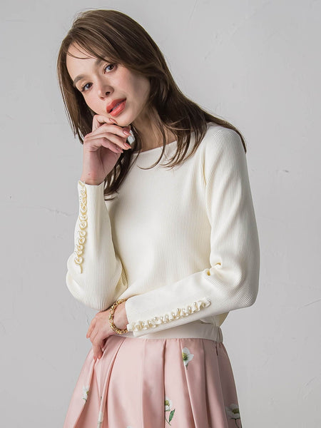 【デザインの特徴】袖口にフリルとパールをあしらった、上品でエレガントなリブニット。コンパクトなサイズ感でインナーにもスッキリ合わせていただけます。ネックは鎖骨が少し見える開きで首元が美しくスッキリと見えます。着心地の良い肌触りとストレッチ感のある糸を使用。【素材の特徴】シーズンレスな素材感で、程良く肌に馴染むニットです。ストレッチ性に富みチクチクしないので、インナーニットとしてもノンストレスに着ていただけます。----------------------------------------------------------------洗濯方法家庭洗濯:液温は40℃を限度とし、手洗いができる。自然乾燥:日陰の平干しがよい。アイロン:底面温度120℃を限度としてアイロン仕上げができる。ドライクリーニング:石油系溶剤による弱いドライクリーニングができる。----------------------------------------------------------------■モデル身長 169cm/着用サイズ M※画像の商品はサンプルとなりますので実際の商品と仕様、加工、サイズが若干異なる場合がございます。※お客様のモニター環境により実際のお色と多少異なる場合がございます。※撮影状況や光の当たり具合により、色合いが異なって見える場合がございます。※商品タグに記載されたサイズはヌードサイズです。実際の商品のサイズは商品情報の実寸をご確認ください。関連ワード:Viaggio Blu ビアッジョブルー レディース 新作 大人カジュアル 大人コーデ レディース キレイめ フェミニン エレガント 華やか 上品 秋 秋服 2025AW AW 2025秋冬